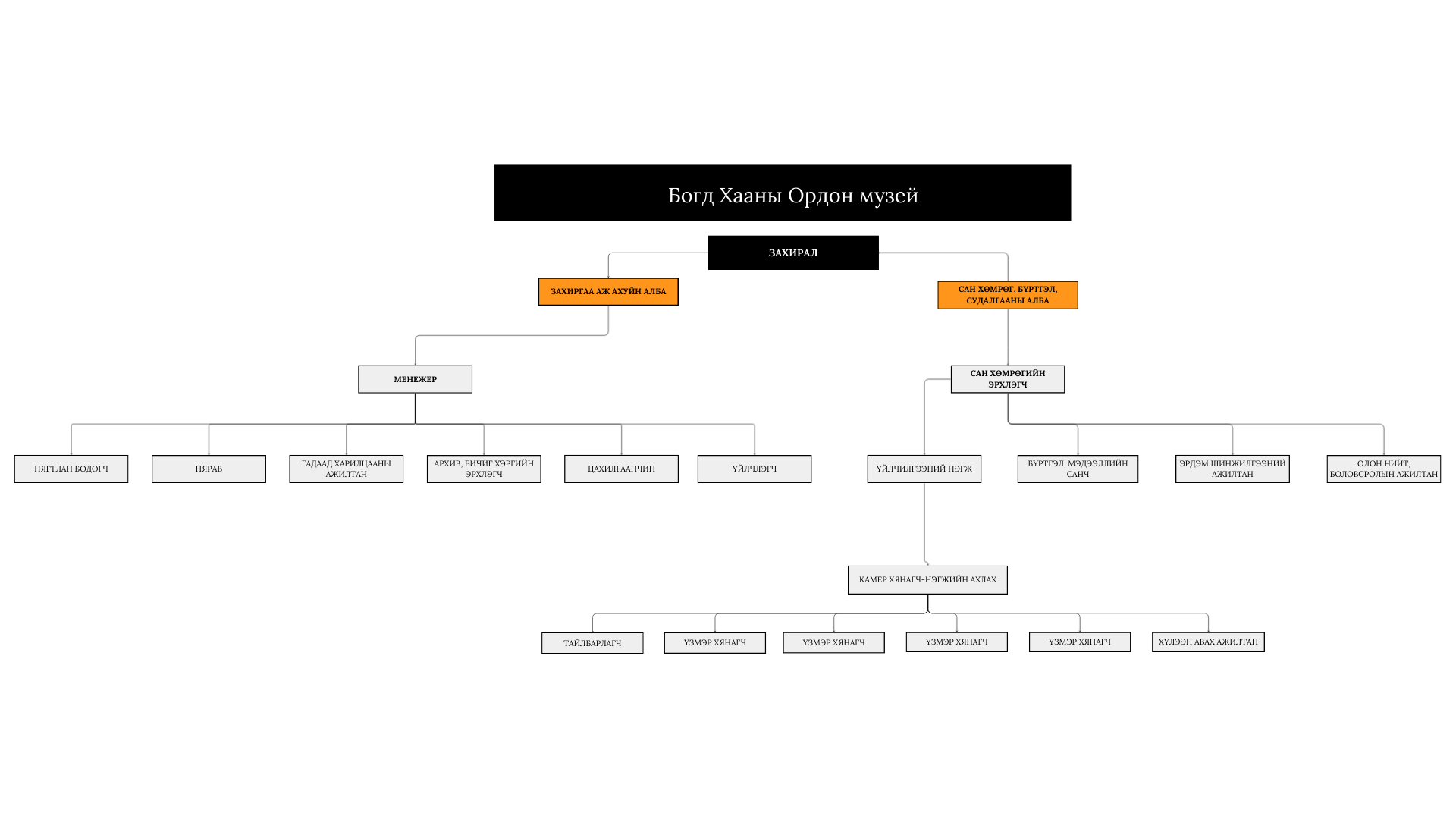 Музей нийт 21 ажилтны орон тоотой соёлын үйлчилгээний төсвийн байгууллага бөгөөд захиргаа, аж ахуйн алба, сан хөмрөг, бүртгэл, судалгааны алба гэсэн хоёр албатайгаар үйл ажиллагаагаа явуулдаг.